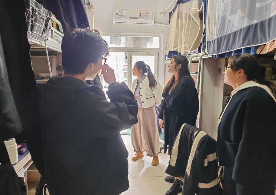 检查过程中,老师们坚持“严管与厚爱并重”,与学生亲切交流。一方面耐心宣讲水电安全规范,强调“人走电断”、规范使用水电设备的重要性,提升学生安全防范意识。另一方面倾听学生在住宿生活中的实际需求,针对寝室设施维护、环境优化等问题现场协调解决方案,传递学院对学生的关怀。